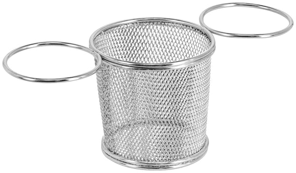 Okrągły koszyk do frytek wykonany ze stali nierdzewnej. Zawiera dwa uchwyty na dwie miski na sosy. Dostępna jest również pasująca papierowa wkładka z nadrukiem gazety. Łatwy w pielęgnacji, bezpieczny dla żywności i można go myć w zmywarce.