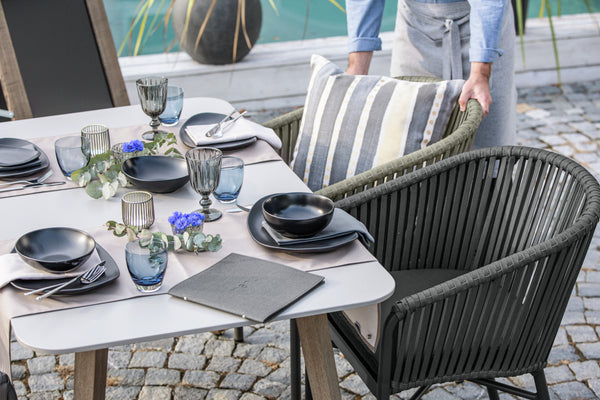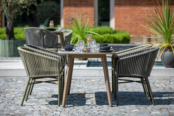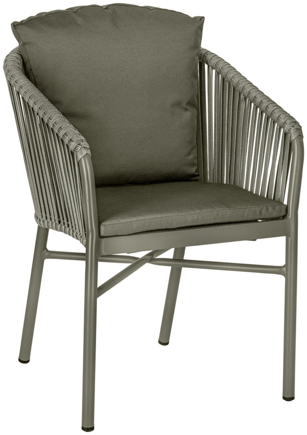 Nowoczesne krzesło ogrodowe wykonane z malowanej proszkowo aluminiowej ramy i plecionki (szerokość 15 mm). Zawiera poduszkę na siedzisko wykonaną z tkaniny olefinowej (100% polipropylen), zdejmowaną i nadającą się do prania w temperaturze 30°C. Wysokość poduszki siedziska 3 cm. Możliwość sztaplowania i odporność na warunki atmosferyczne. Nadaje się do użytku na zewnątrz. Dostarczane w stanie zmontowanym. Możliwość zamówienia pasującej poduszki na oparcie lub mebli wypoczynkowych.