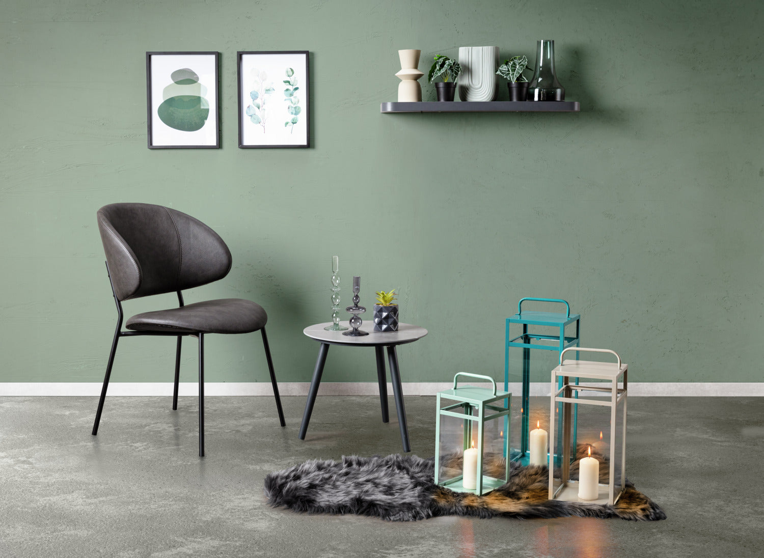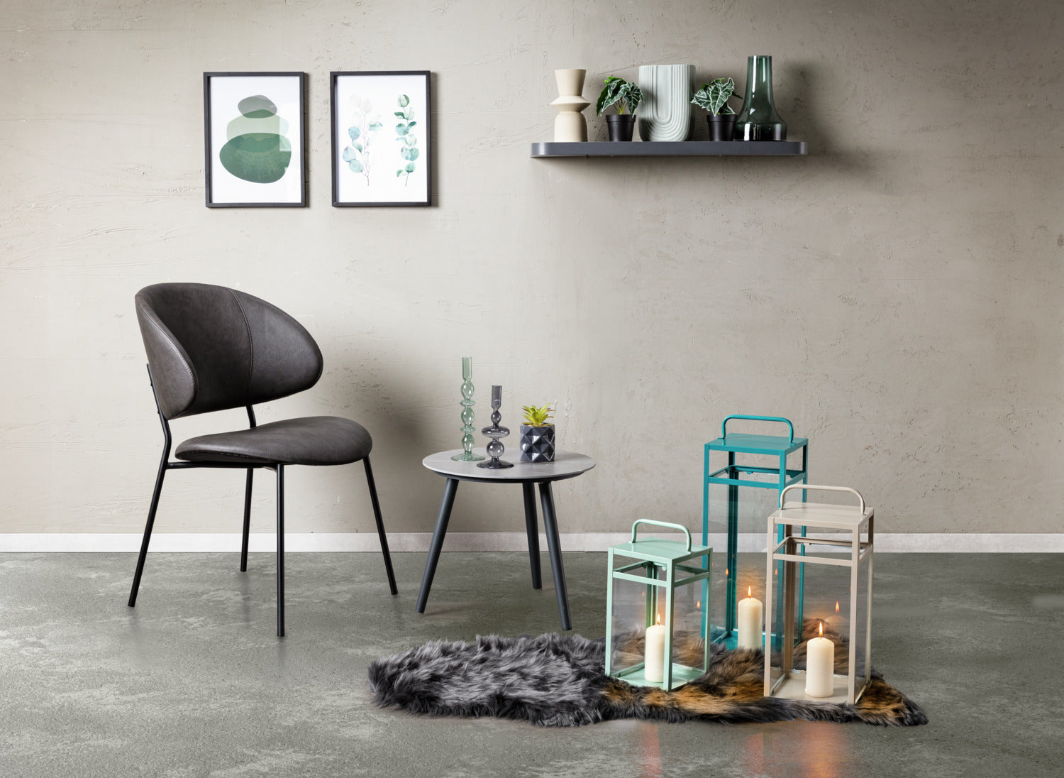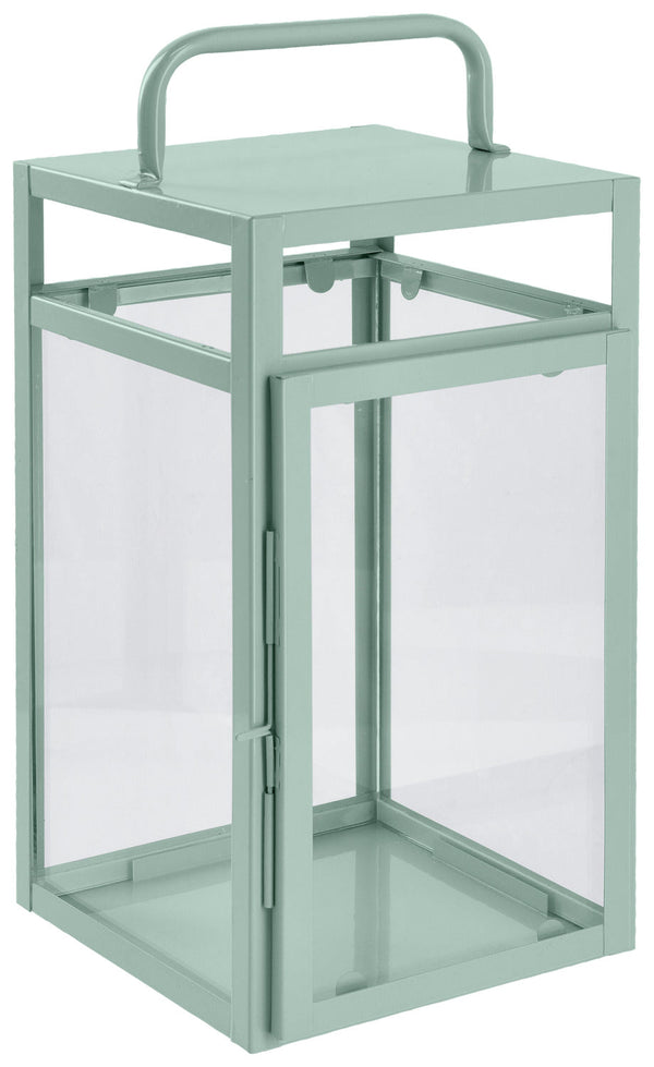 Metalowy lampion o prostym kształcie z częściowo otwartymi okienkami.