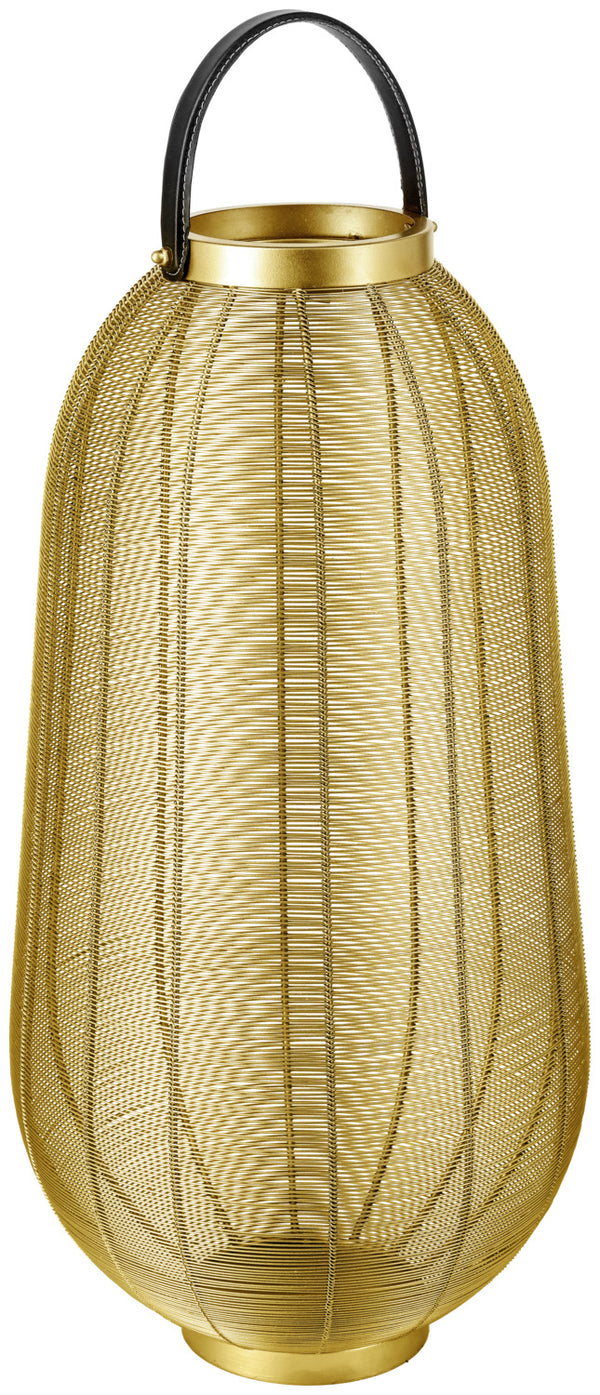 Metalowy lampion z czarnym uchwytem z imitacji skóry.