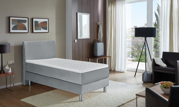 Łóżko z materacem sprężynowym w praktycznym komplecie. Skrzynia z rdzeniem ze sprężyn bonellowych. Sprężyny bonellowe o grubości 2,2 mm. Tapicerowana rama z litego drewna. 7-strefowy materac kieszeniowy z 540 sprężynami na 2 m². Nakładka z zimnej pianki zapewniająca komfort snu. Klasyczne, proste wezgłowie - wysokość 110 cm. Odporne na rdzę metalowe nóżki w kolorze srebrnym. Wysokość wejścia: 60 cm. Wysokość nóżek 16 cm + skrzynia 22 cm + materac 17 cm + topper 5 cm łącznie: 60 cm. Z welurowym pokrowcem. Dostępne jako łóżko pojedyncze lub podwójne. Dostawa wraz z elementami łączącymi. Nóżki łóżek można znaleźć w pudełku przy dostawie.