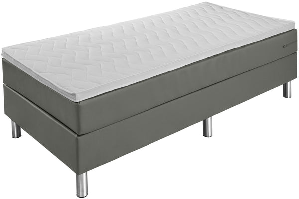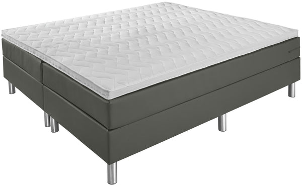 Łóżko hotelowe w praktycznym komplecie. Puste pudełko. Tapicerowana rama. Pięciostrefowy materac kieszeniowy z 540 sprężynami na 2 m². Nakładka z zimnej pianki zapewniająca komfort snu. Bez części tylnej. Odporne na rdzę metalowe nóżki w kolorze srebrnym. Wysokość wejścia: 58 cm. Wysokość nóżek 16 cm + skrzynia 20 cm + materac 17 cm + topper 5 cm łącznie: 58 cm. Pokrycie z imitacji skóry. Dostępne jako łóżko pojedyncze lub podwójne. Dostawa wraz z elementami łączącymi. Nóżki łóżka można znaleźć w pudełku przy dostawie.
