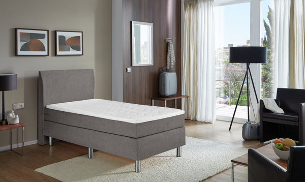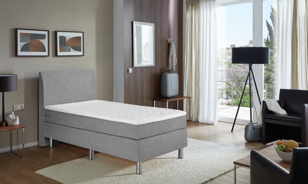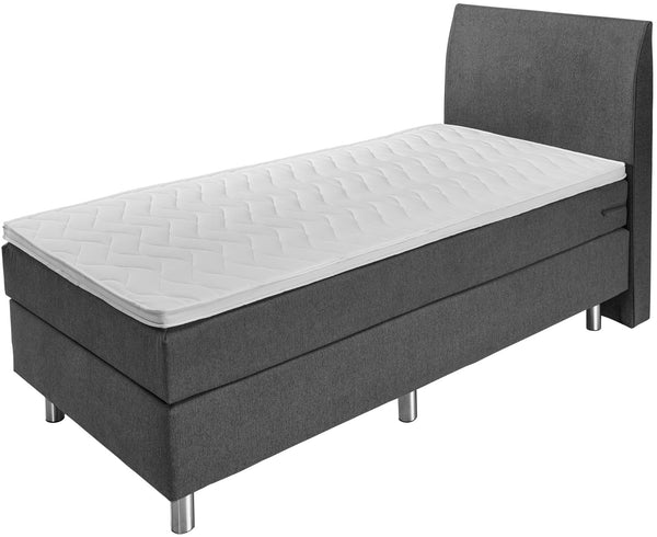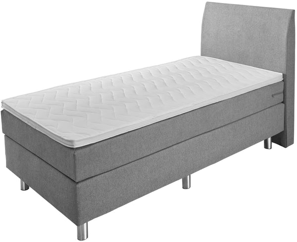 Łóżko z materacem sprężynowym w praktycznym komplecie. Skrzynia z rdzeniem ze sprężyn bonellowych. Sprężyny bonellowe o grubości 2,2 mm. Tapicerowana rama. Nakładka z zimnej pianki zapewniająca komfort snu. Klasyczne, proste wezgłowie - wysokość 110 cm. Odporne na rdzę metalowe nóżki w kolorze srebrnym. Wysokość wejścia: 63 cm. Wysokość nóżek 16 cm + skrzynia 20 cm + materac 21 cm + topper 6 cm łącznie: 63 cm. Z pokrowcem z tkaniny tapicerskiej. Dostępne jako łóżko pojedyncze lub podwójne. Dostawa wraz z elementami łączącymi. Nóżki łóżka można znaleźć w pudełku przy dostawie.