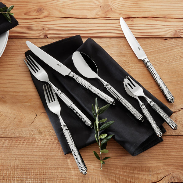 Stal nierdzewna chromoniklowa 18/10. Łyżka do przystawek/deserów o nietypowym designie. Delikatne tłoczone zdobienie w okrągłej, ciężkiej rękojeści. Wypolerowana na wysoki połysk. Grubość materiału 3 mm (mierzona w najmocniejszym punkcie widelca). Można myć w zmywarce.