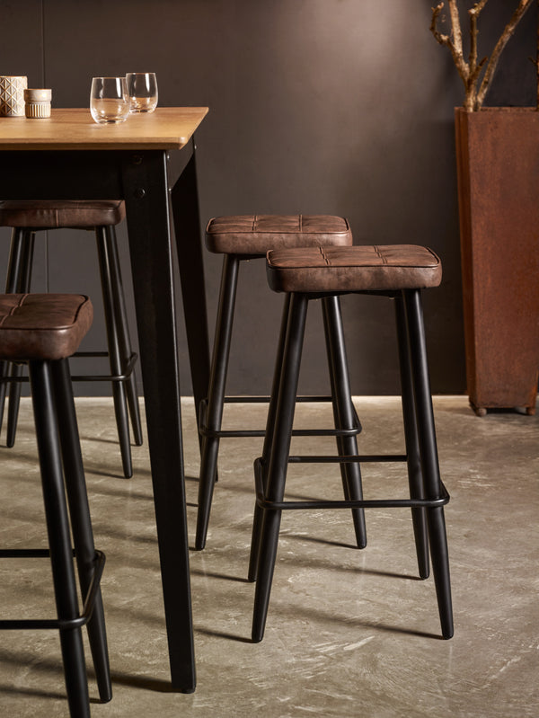 Stołek barowy z malowaną proszkowo stalową ramą i tapicerką z imitacji skóry z ozdobnymi przeszyciami i pikowaniem. Łatwy do czyszczenia. Nadaje się wyłącznie do użytku wewnątrz pomieszczeń. Dostarczany zdemontowany. Tylko siedzisko musi być zamontowane na ramie. Materiał montażowy wchodzi w zakres dostawy. Zamów pasujące krzesło w tym samym czasie.