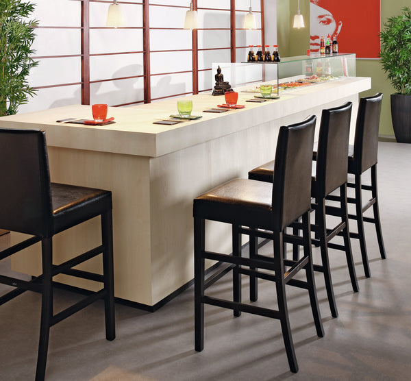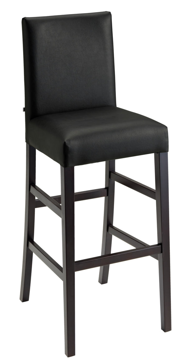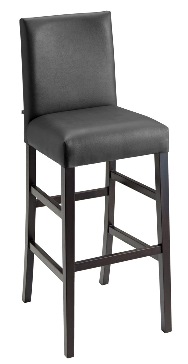 Wysokiej jakości krzesło barowe wykonane z litego drewna bukowego i tapicerowane imitacją skóry. Pokrycie ognioodporne. Nadaje się wyłącznie do użytku wewnątrz pomieszczeń. Dostarczane w stanie zmontowanym. Płytka na podnóżek ze stali nierdzewnej do zamówienia osobno.