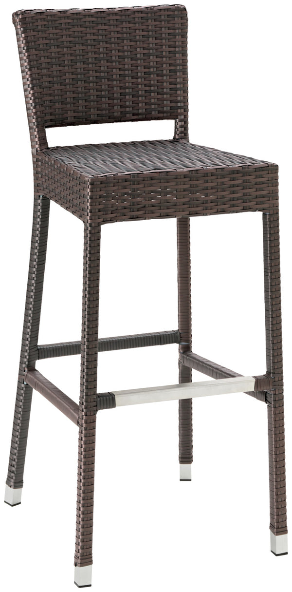 Klasyczne krzesło barowe na zewnątrz wykonane z wysokiej jakości markowej wikliny z wytrzymałą aluminiową ramą. Zintegrowane zabezpieczenie podnóżka wykonane z wysokiej jakości szczotkowanej stali nierdzewnej. Aluminiowe nakładki na stopkach. Odporne na warunki atmosferyczne, promieniowanie UV i łatwe do czyszczenia. Nadaje się do użytku na zewnątrz. Zamów jednocześnie pasujące krzesła i stoły z serii Metropolitan.