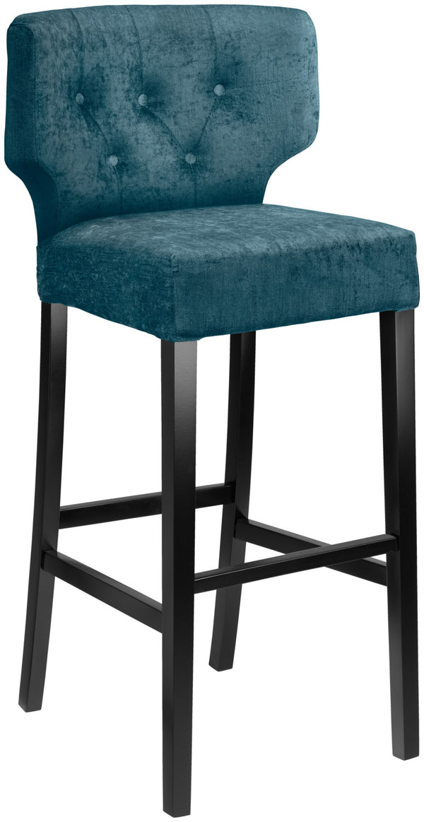 Krzesło barowe z aksamitnym obiciem (96% poliester, 4% wiskoza) i lakierowaną na czarno ramą z drewna bukowego. Tapicerka z wysokiej jakości sprężynami Nosag. Guziki na oparciu. Bardzo wygodne. Pokrowiec trudnopalny. Podnóżek należy zamówić osobno (nr zamówienia 10094575). Nadaje się tylko do użytku wewnątrz pomieszczeń. Zamów jednocześnie inne meble z serii Teatro.