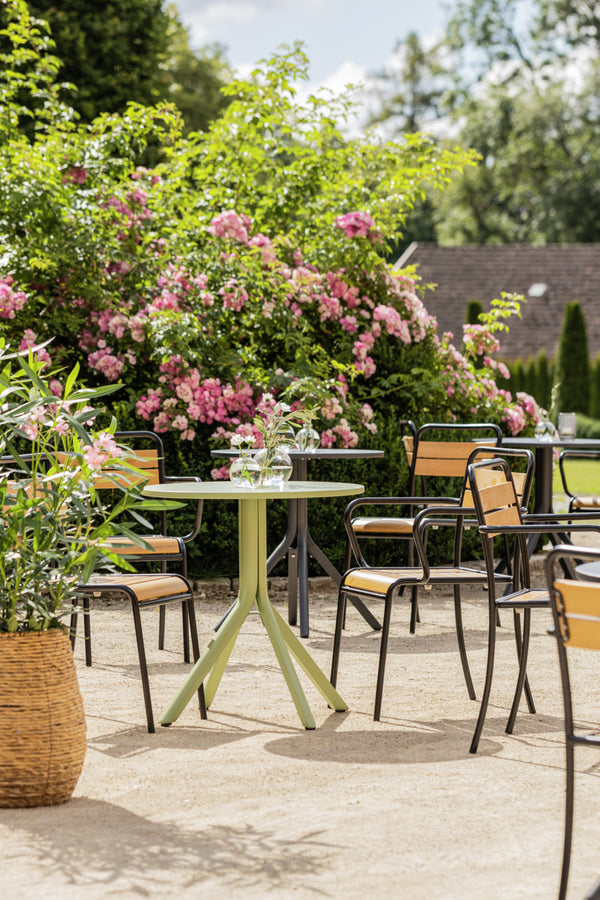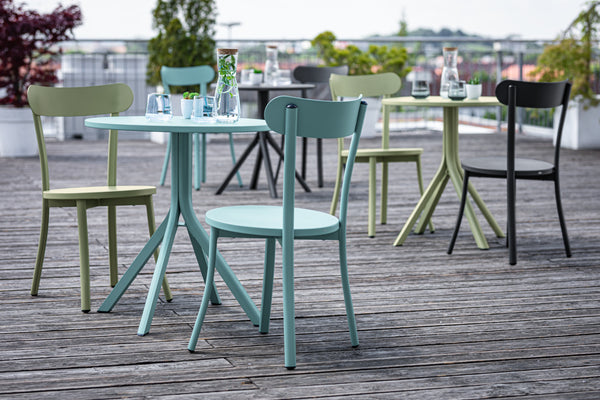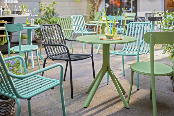 Stół zewnętrzny wykonany z malowanego proszkowo aluminium. Zawiera regulowane ślizgacze do kompensacji nierówności podłoża. Odporny na warunki atmosferyczne i promieniowanie UV. Odpowiedni do użytku na zewnątrz. Dostarczany zdemontowany, wraz z materiałem montażowym. Pasujące krzesła można zamówić w tym samym czasie.