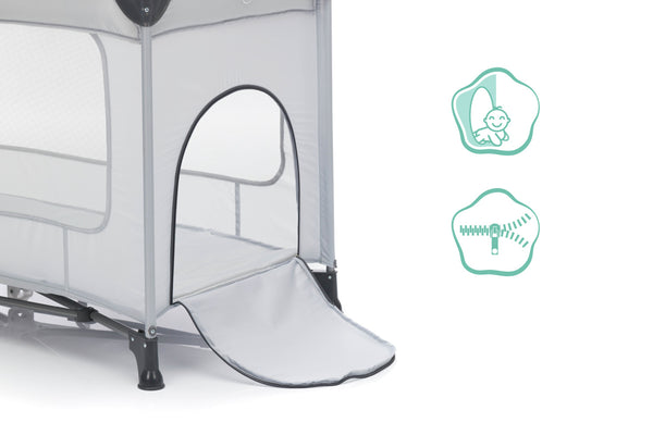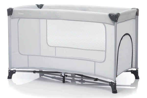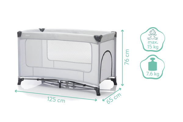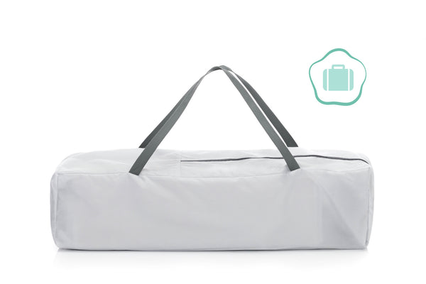 Składane łóżeczko turystyczne wykonane z tworzywa sztucznego z poliestrową osłoną, w kompaktowej torbie transportowej. Maksymalne obciążenie 15 kg. Możliwość zamówienia pasującego materaca.