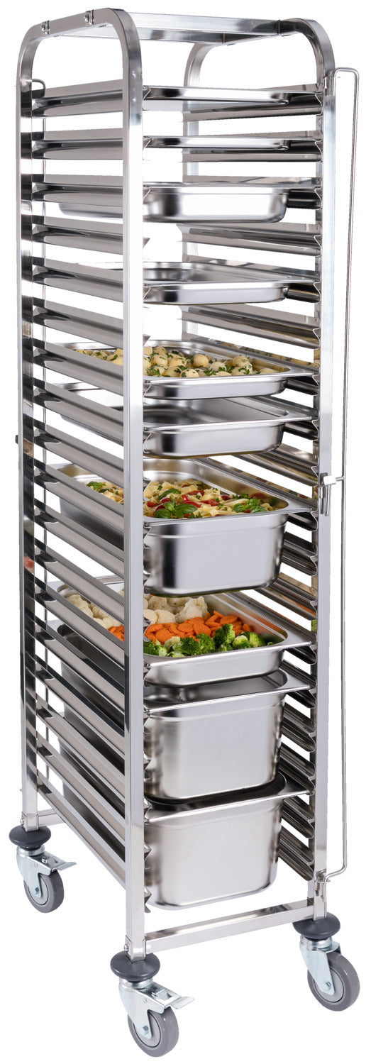 Bardzo wytrzymały wózek ze stali nierdzewnej. Wyposażony w 18 szyn na tace GN lub pojemniki GN (GN 1/1). Kwadratowa rama rurowa (średnica 2,5 x 2,5 cm); rozstaw wsporników 8,5 cm. Ze wspornikami ze stali nierdzewnej po obu stronach do przepychania i ochrony podczas transportu. Cztery kółka skrętne wykonane z wysokiej jakości PVC, z odbojnikami ściennymi, o średnicy Ø 10 cm, dwa z hamulcami blokującymi. Maksymalne obciążenie 150 kg. Dostarczany w stanie rozmontowanym, łatwy do samodzielnego montażu.