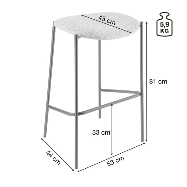 Stołek barowy z modnym obiciem z tkaniny bouclé (100% poliester) i malowaną proszkowo stalową ramą. Nadaje się wyłącznie do użytku wewnątrz pomieszczeń. Dostarczany w stanie zmontowanym.