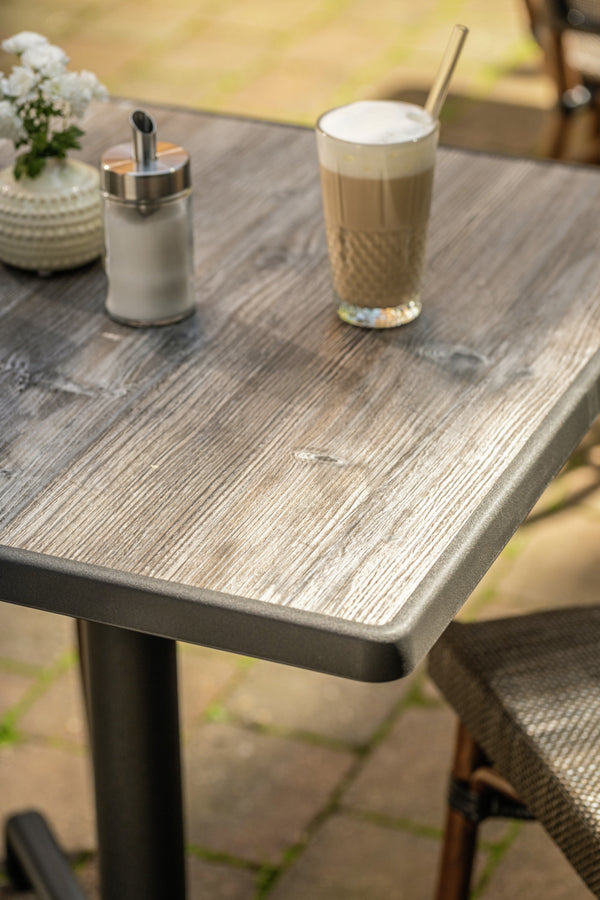 Wytrzymały blat stołu wykonany z kompozytu drewna i tworzywa sztucznego z całkowicie uszczelnioną plastikową krawędzią ochronną. Grubość materiału 1,6 cm; krawędź 2,7 - 3 cm. Odporny na ciepło, promieniowanie UV, odparzenia papierosami i warunki atmosferyczne. Nadaje się do użytku na zewnątrz. Materiał montażowy jest dołączony do kolumn stołowych. Pasujące kolumny stołowe można zamówić w tym samym czasie.