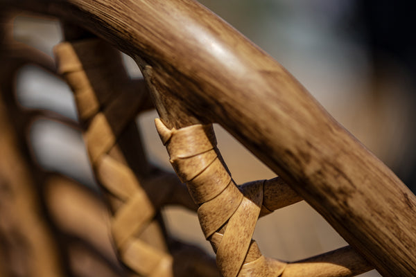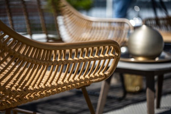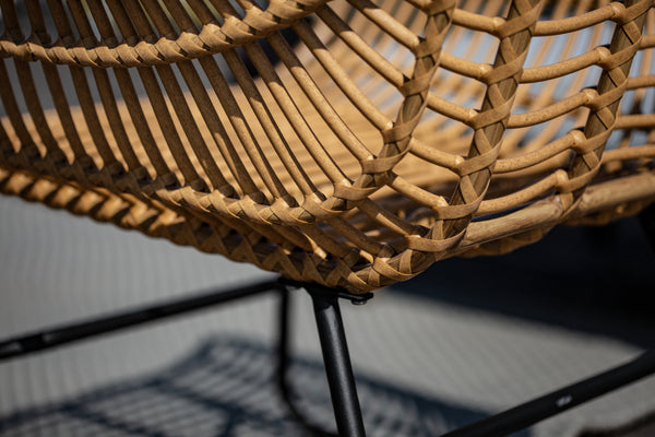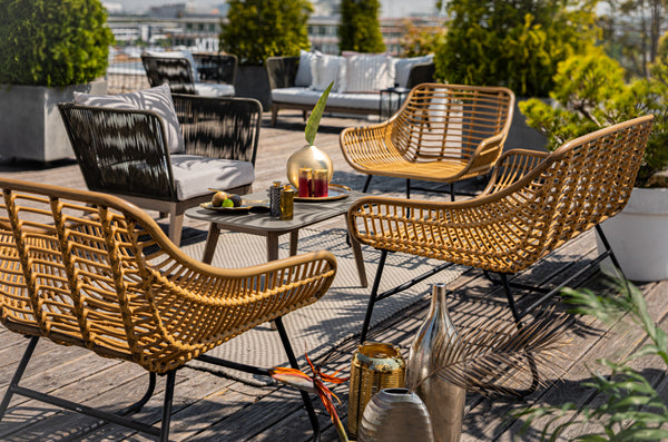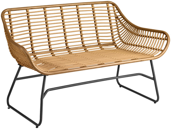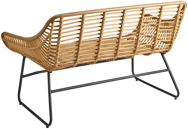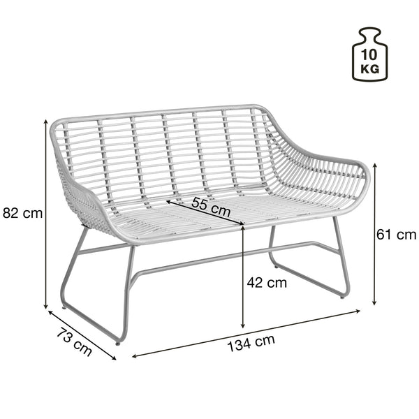 Dwuosobowa sofa wykonana z malowanej proszkowo aluminiowej ramy i polirattanowej wikliny o wyglądzie bambusa. Zawiera plastikowe prowadnice. Nadaje się do użytku na zewnątrz. Dostarczana w stanie rozmontowanym. Pasujące poduszki na siedziska można zamówić w tym samym czasie.