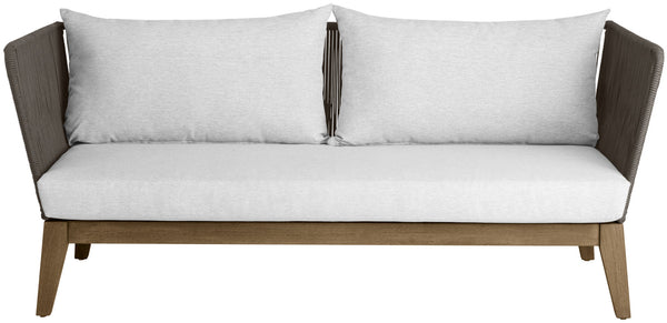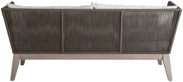 Stylowa sofa zewnętrzna wykonana z ramy z drewna eukaliptusowego ze specjalnym wykończeniem lakierem. Oparcie wykonane z ocynkowanej stali owiniętej wikliną Rope. Poduszki siedziska i oparcia wykonane z tkaniny olefinowej (100% polipropylen). Odporna na warunki atmosferyczne i promieniowanie UV. Bardzo wygodna dzięki dużej powierzchni do siedzenia. Dostarczana zdemontowana, wraz z materiałem mocującym. Nadaje się do użytku na zewnątrz. Możliwość zamówienia pasującego fotela w tym samym czasie.