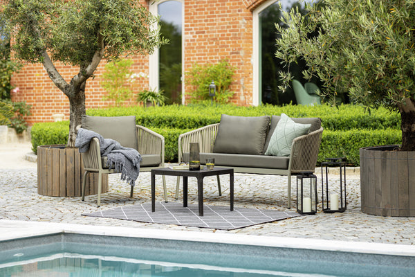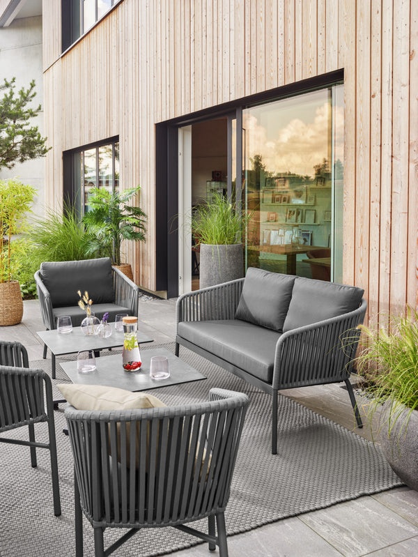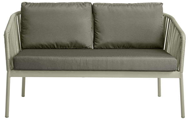 Nowoczesna sofa zewnętrzna wykonana z malowanej proszkowo aluminiowej ramy i oplotu linowego (szerokość 15 mm). Zawiera poduszki na siedzisko i oparcie wykonane z tkaniny olefinowej (100% polipropylen), zdejmowane i nadające się do prania w temperaturze 30°. Wysokość poduszki siedziska 10 cm. Wymiary poduszki oparcia: 40x60x16 cm (szer. x wys. x gł.). Możliwość sztaplowania i odporność na warunki atmosferyczne. Nadaje się do użytku na zewnątrz. Dostarczana w stanie zmontowanym. Możliwość zamówienia pasującego fotela lub krzesła w tym samym czasie.