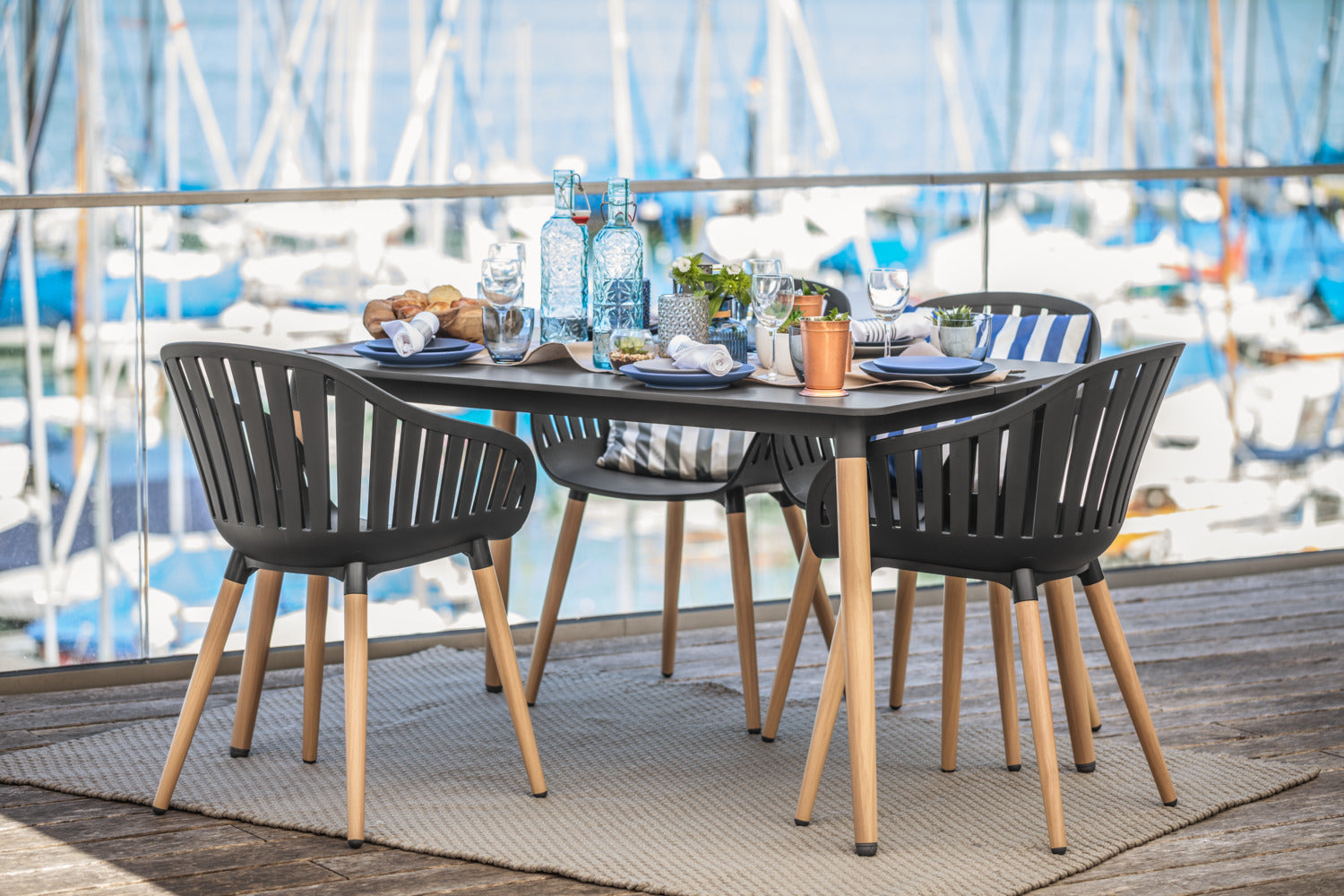 Innowacyjna seria mebli ogrodowych z krzesłami i stołami. Nogi krzeseł i stołów wykonane z aluminium o wyglądzie prawdziwego drewna, siedziska krzeseł wykonane z wytrzymałego tworzywa sztucznego. Blat stołu wykonany z wytrzymałej płyty Duraboard, mieszanki wiórów drewnianych i żywic polietylenowych. Dodatkowa wielowarstwowa powłoka sprawia, że powierzchnia jest bardzo wytrzymała i odporna na warunki atmosferyczne. Plastikowe ślizgacze na nóżkach chronią podłogę. Nadaje się również do użytku wewnątrz pomieszczeń. Bardzo łatwy montaż. * Zestaw składa się z: 1x stołu 130x80x72 cm i 4 krzeseł w kolorze czarnym. Materiał nóg krzeseł i stołu: wysokiej jakości aluminium malowane proszkowo. Materiał siedziska: tworzywo sztuczne. Materiał blatu stołu: Duraboard. Łatwy do czyszczenia! Odporność na warunki atmosferyczne! Odporny na promieniowanie UV!