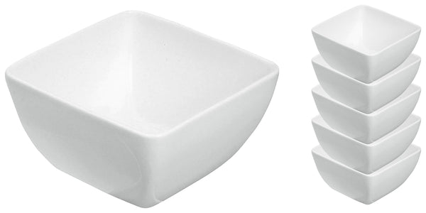 Biała porcelanowa miska w kształcie kwadratu. Można myć w zmywarce i używać w kuchence mikrofalowej.