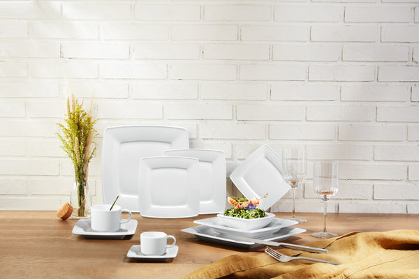 Miska z białej porcelany. W kształcie kwadratu. Prosty projekt. Można myć w zmywarce i używać w kuchence mikrofalowej.
