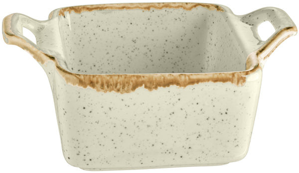 Kolorowa miska z uchwytem, wykonana z porcelany imitującej ceramikę. Kwadratowy kształt. Z lekko nieregularnymi krawędziami z glazury. Można myć w zmywarce i używać w kuchence mikrofalowej.