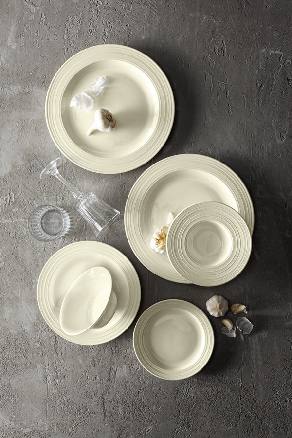 Kremowa miseczka z porcelany ozdobiona dekoracyjnym reliefem. Nowoczesny design. Olśniewająca glazura. Można myć w zmywarce i używać w kuchence mikrofalowej.