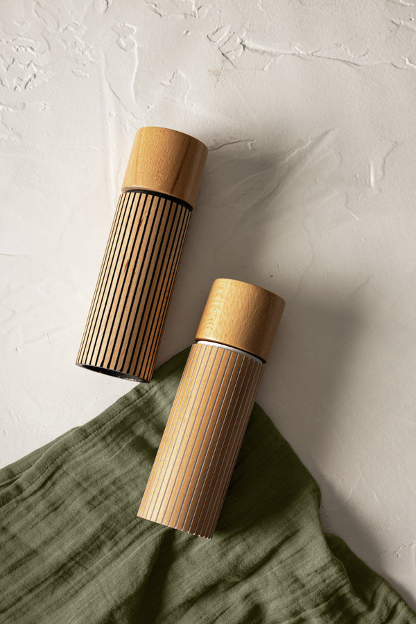 Nowoczesny młynek do soli z rowkowaną konstrukcją i wykończeniem białym lakierem, dzięki czemu zawartość jest widoczna z zewnątrz. Wyposażony w mechanizm mielący ze stali nierdzewnej.