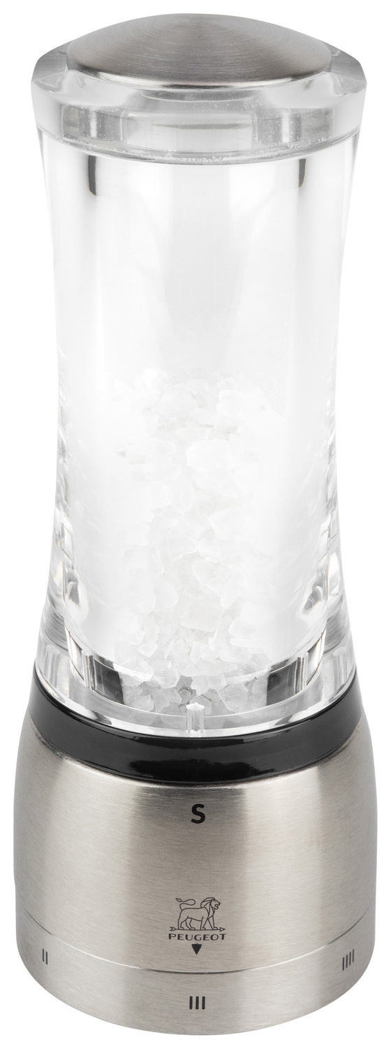 Młynki do pieprzu i soli Daman z opatentowaną technologią U'Select przyciągają wzrok na zastawionym stole i podkreślają nowoczesny design swoim prostym kształtem. Model Daman posiada dwie inne cechy szczególne: pokrywę ze stali nierdzewnej, która jest utrzymywana na miejscu za pomocą magnesów oraz cały przezroczysty korpus, który może służyć do przechowywania. Podobnie jak cała gama u'Select, młynek do przypraw Daman ma 6 stopni mielenia. Młynek do soli Peugeot przeznaczony jest do mielenia grubej, suchej soli. Ponieważ jest wykonany ze stali nierdzewnej, nie podlega korozji. Jakiej soli użyć? Dla optymalnej pracy zalecamy stosowanie ziaren soli o średnicy ok. 4 mm (sól gruboziarnista, sucha: morska lub kamienna).