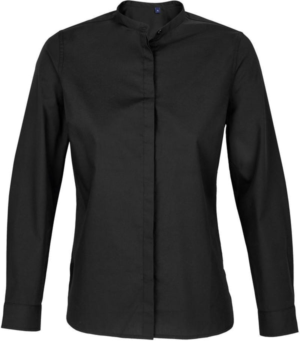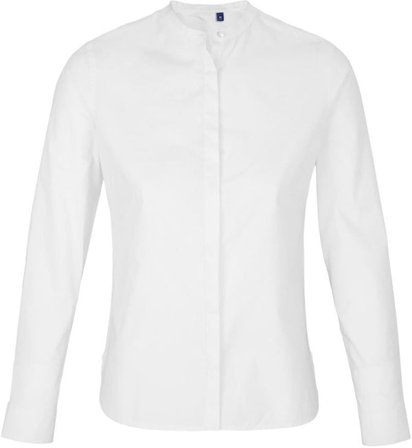 Bluzka damska z tkaniny z przewagą bawełny organicznej. Dopasowany krój podkreśla kobiecą sylwetkę. Niska stójka i kryte zapięcie zapewniają elegancki wygląd. Bluzka stanowi doskonałe dopełnienie profesjonalnego uniformu w hotelarstwie czy gastronomii.