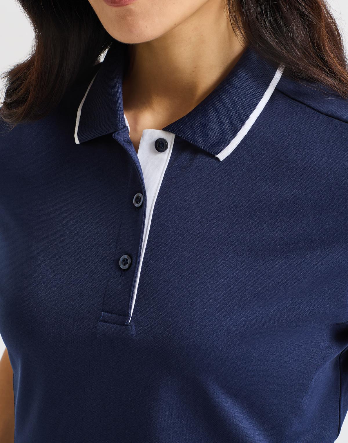 Koszulka polo, która idealnie wpasuje się w kolory Twojej marki dzięki kontrastowym paskom na kołnierzyku, listwie guzikowej i rękawkach. Kołnierzyk i mankiety z dzianiny ściągaczowej prezentują się schludnie i elegancko. Lista z zapięciem na 3 guziki pozwala regulować głębokość dekoltu. Dzianina Coolchecker została specjalnie zaprojektowana, aby odprowadzać wilgoć z dala od ciała i regulować przepływ powietrza, dbając tym samym o świeżość podczas wykonywania obowiązków. Boczne panele dbają o subtelne dopasowanie koszulki do sylwetki, a boczne rozcięcia zwiększają swobodę ruchu.