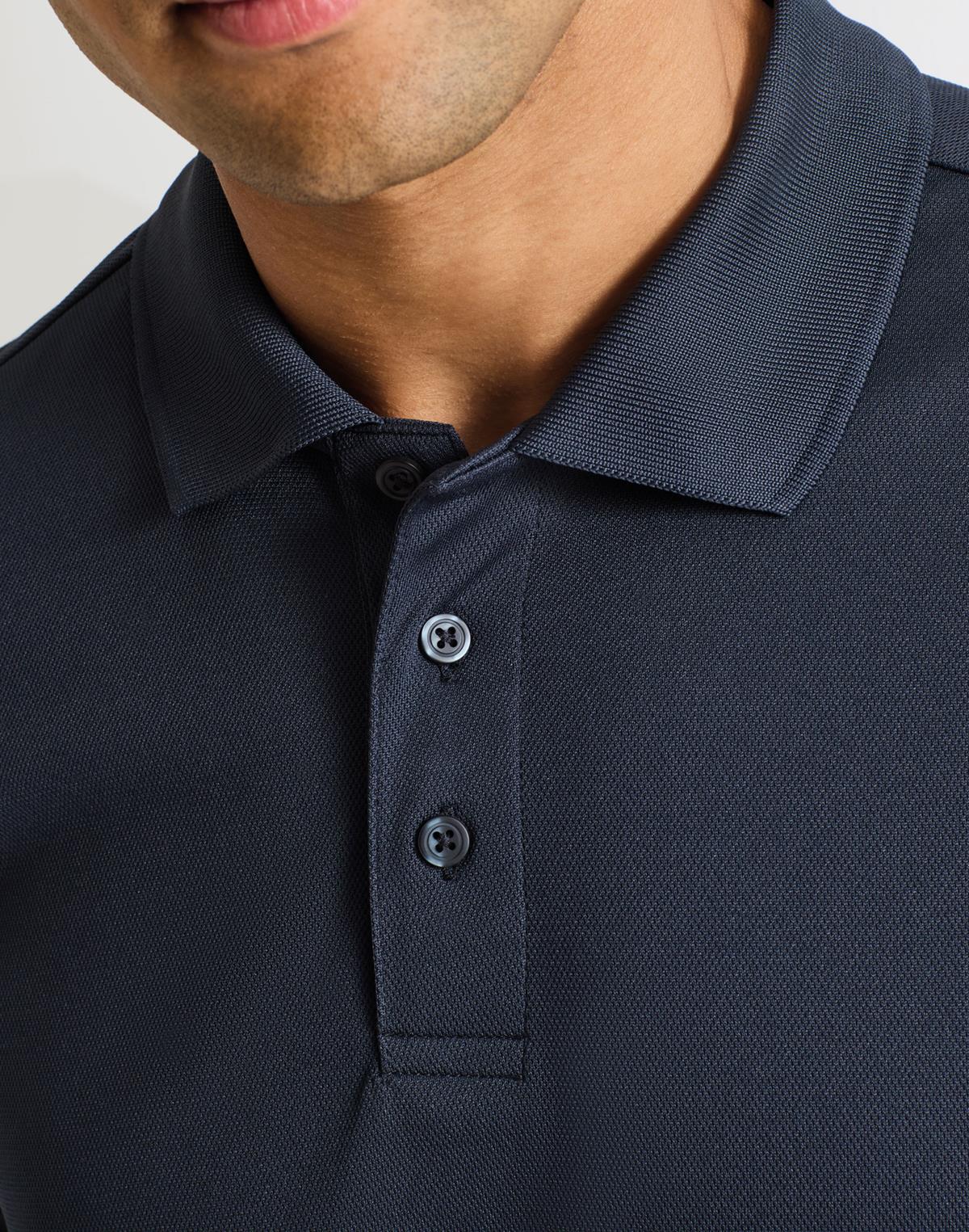 Męska koszulka polo z krótkim rękawem uszyta z poliestru pochodzącego z recyklingu. Właściwości dzianiny gwarantują oddychalność i odprowadzanie wilgoci, dzięki czemu pracownik zachowuje świeżość i chłód. Koszulka posiada prążkowany kołnierzyk, listwę z zapięciem na trzy guziki i boczne rozcięcia.