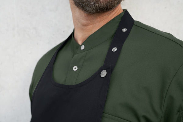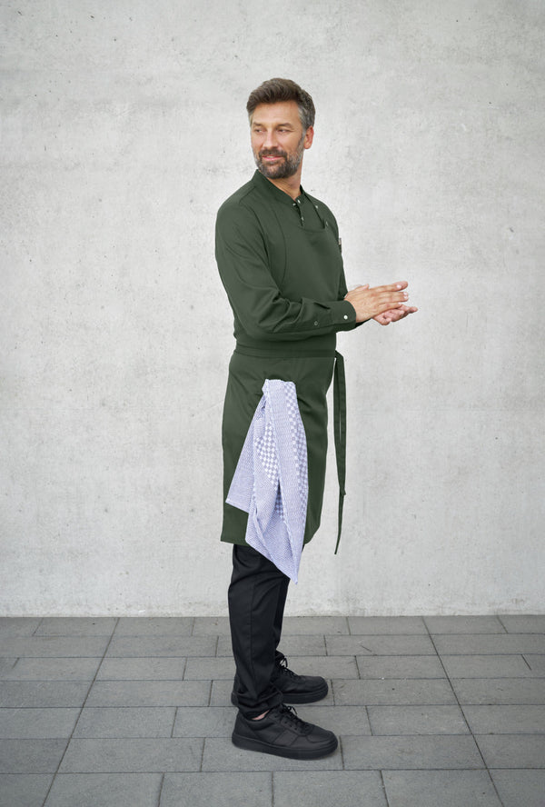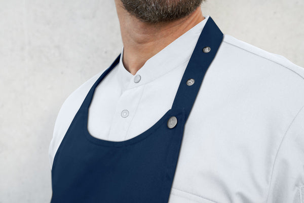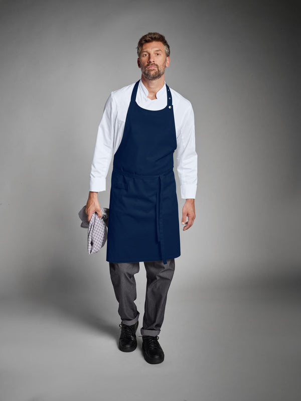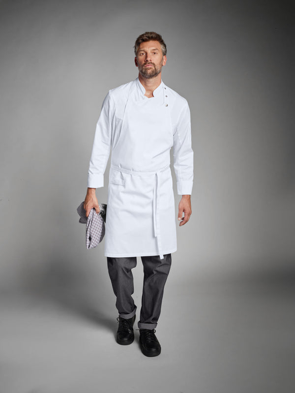 Wysokiej jakości fartuch bez kieszeni wykonany z gładkiej, łatwej w pielęgnacji tkaniny mieszanej. Z zaokrąglonym karczkiem i dołączoną pętelką na ściereczkę z boku. Pasek na szyję posiada regulację długości za pomocą zatrzasków. Pasek w talii wykonany z tkaniny zasadniczej, do wiązania. Tkanina 65% poliester, 35% bawełna. 200 g/m². Pranie w 60°.