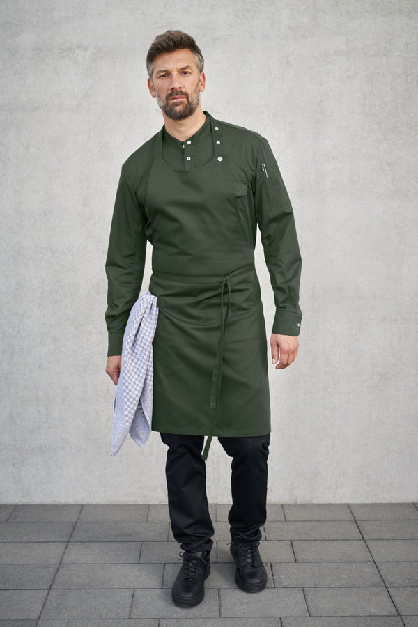 Wysokiej jakości fartuch bez kieszeni wykonany z gładkiej, łatwej w pielęgnacji tkaniny mieszanej. Z zaokrąglonym karczkiem i dołączoną pętelką na ściereczkę z boku. Pasek na szyję posiada regulację długości za pomocą zatrzasków. Pasek w talii wykonany z tkaniny zasadniczej, do wiązania. Tkanina 65% poliester, 35% bawełna. 200 g/m². Pranie w 60°.