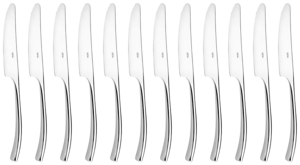 Stal nierdzewna chromowana 13/0. Nowoczesny nóż do przystawek/deserów. Wypolerowany na wysoki połysk. Nóż stoi na ostrzu i przyciąga wzrok na stole. Grubość materiału 3,5 mm odpowiednia dla gastronomii (mierzona w najmocniejszym punkcie widelca obiadowego). Można myć w zmywarce.