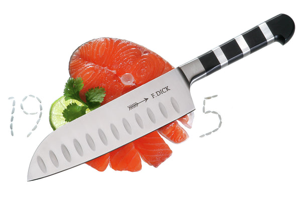 Oferujemy kuty klasyk kuchni azjatyckiej w postaci naszego Santoku z 1905 roku o ząbkowanej konstrukcji. W żadnej kuchni nie powinno zabraknąć wszechstronnego noża do warzyw i mięsa. Santoku 1905 charakteryzuje się cienkim ostrzem ze skosem w kształcie klina. Zaostrzony koniec ostrza można wykorzystać np. do dekoracji. Rowkowany szlif i powstająca poduszka powietrzna zapobiegają przyklejaniu się produktów do ostrza podczas cięcia. Atrakcyjny uchwyt sprawia, że Santoku będzie przyciągać wzrok w Twojej kuchni. Ostrze o długości 18 cm wykonane ze stali X55CrMoV14 zostało zaprojektowane z myślą o ekstremalnej ostrości i przy twardości 56° HRC można je optymalnie naostrzyć za pomocą stalowej ostrzałki F. DICK.