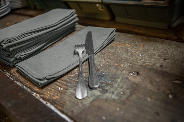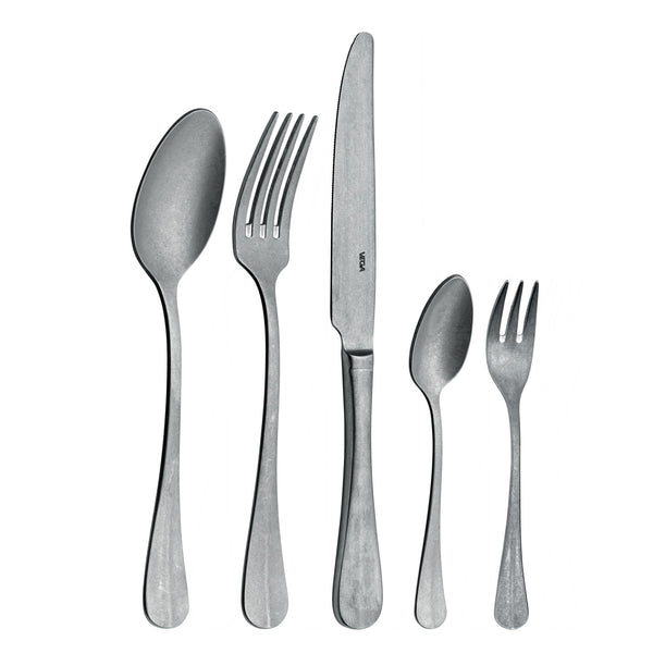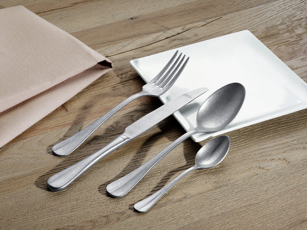 Klasyczny i ponadczasowy nóż obiadowy z efektem patynowania. Ciekawostką jest to, że wygląd ten nie jest tworzony przez powłokę, ale przez specjalnie opracowany i skomplikowany proces. Grubość materiału klasy gastronomicznej 3 mm (mierzona w najgrubszym punkcie widelca). Można myć w zmywarce. Chromowana stal nierdzewna 13/0.