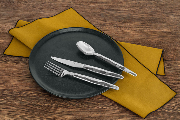 Stal nierdzewna chromowana 13/0. Niezwykły nóż do pizzy/steków z kanciastym reliefem. Rękojeść matowa. Grubość materiału 6 mm odpowiednia dla gastronomii (mierzona w najmocniejszym miejscu widelca obiadowego). Można myć w zmywarce.