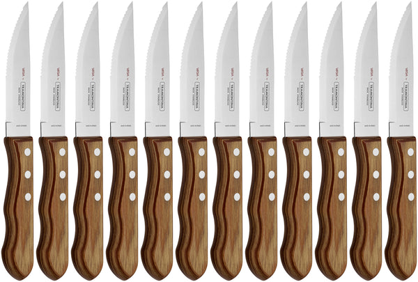 Stal nierdzewna chromowana 13/0. Rękojeść z polidrewna. Nóż do steków Jumbo w znanym designie Tramontina. Twarde ostrze tnące z trwałymi uchwytami z nitami ze stali nierdzewnej. Wykonane z polywood: uchwyty składają się z kilku warstw drewna sosnowego, które są impregnowane żywicą, a następnie prasowane. Można myć w zmywarce.