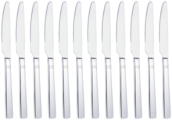 Stal nierdzewna chromowana 13/0. Nowoczesny nóż obiadowy z subtelnym 3-liniowym dekorem na górnej części rękojeści. Wypolerowany na wysoki połysk. Grubość materiału 2,5 mm odpowiednia dla gastronomii (mierzona w najmocniejszym miejscu widelca obiadowego). Można myć w zmywarce.