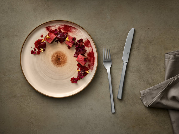 Stal nierdzewna chromowana 13/0. Nóż obiadowy wypolerowany na wysoki połysk. Grubość materiału 4 mm odpowiednia dla gastronomii (mierzona w najmocniejszym punkcie widelca obiadowego). Można myć w zmywarce.