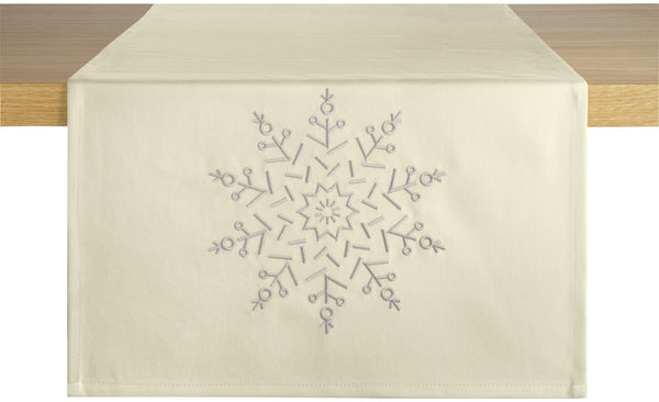 52% poliester, 48% bawełna. Gramatura ok. 220 g/m². Wytrzymały i trwały świąteczny bieżnik z dwoma haftowanymi płatkami śniegu.