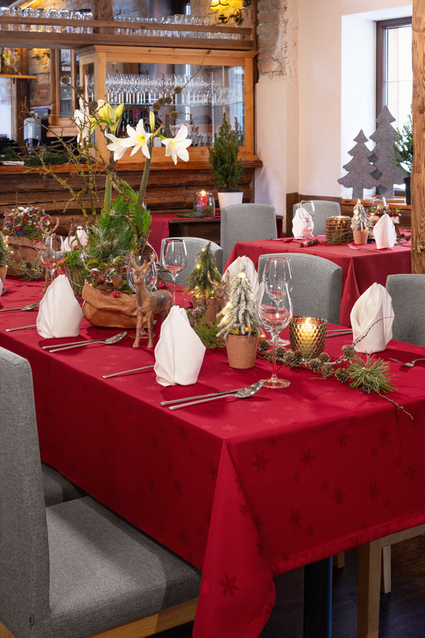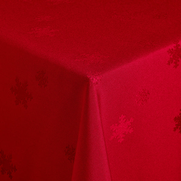 100% poliester. Gramatura ok. 195 g/m². Świąteczny obrus z tkanymi kryształkami lodu ton w ton. Krótki czas schnięcia, dzięki czemu jest szybko gotowy do ponownego użycia. Nieskomplikowana bielizna stołowa w bardzo dobrej cenie. Wytrzymały, łatwy w pielęgnacji.