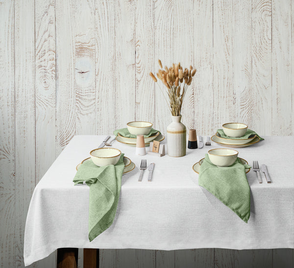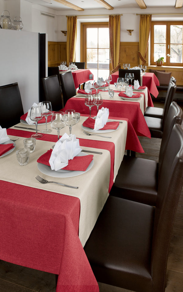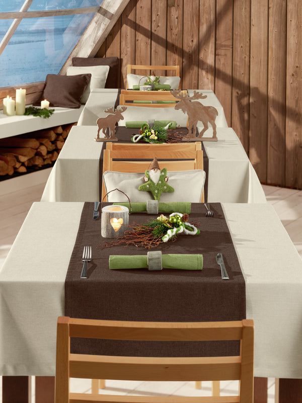 100% poliester. Gramatura ok. 210 g/m². Łatwa w pielęgnacji bielizna stołowa o melanżowym wyglądzie. Wysokiej jakości wykończenie ze szwem kopertowym. Piękna tekstura o naturalnym dotyku. Solidna i trwała. Maksymalna długość belki wynosi 30 metrów i można ją przyciąć do żądanego rozmiaru.