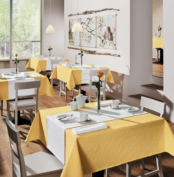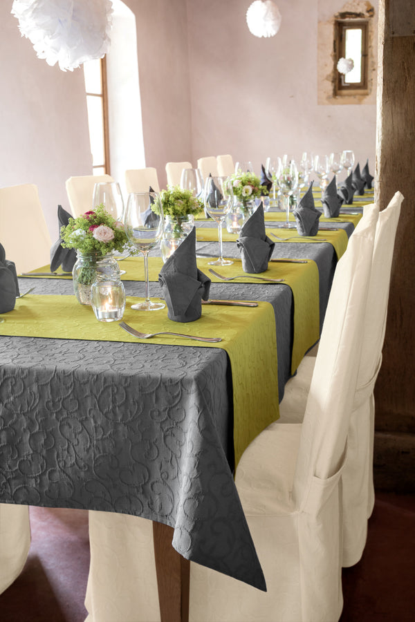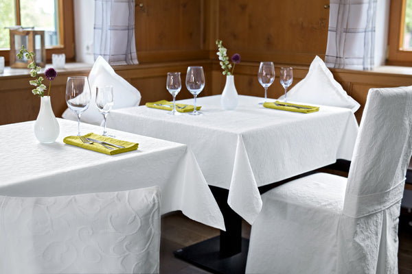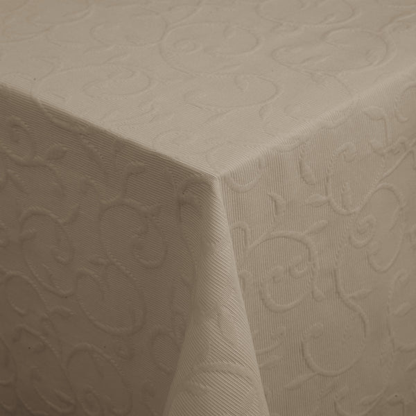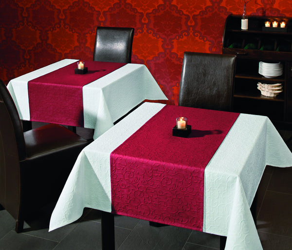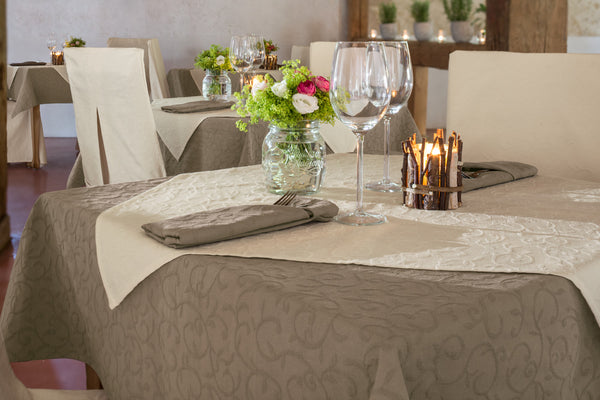 70% bawełna, 30% poliester. Gramatura ok. 250 g/m². Obrus wykonany z mieszanki bawełny i poliestru. Wykończenie odporne na plamy. Żakardowy wzór. Szczególnie łatwy w pielęgnacji, wytrzymały i łatwy w prasowaniu.