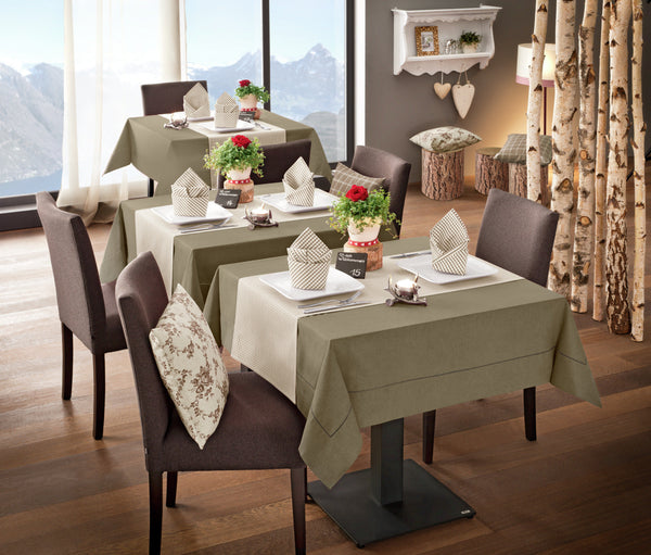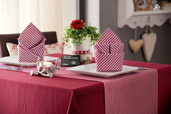 50% bawełna, 50% poliester. Gramatura ok. 230 g/m². Klasyczne obrusy z typowym wzorem w kratkę Vichy. Bardzo trwałe kolory, nawet po wielu praniach. Łatwe w pielęgnacji, szybkoschnące, łatwe w prasowaniu.