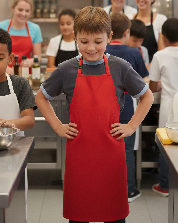 Funkcjonalny fartuszek wykonany z tkaniny mieszanej, która gwarantuje łatwość pielęgnacji. Fartuszek posiada troki do wiązania w pasie oraz pasek na szyję z regulacją i klamerką umożliwiającą szybkie rozpięcie fartuszka. Fartuszek jest dostępny w dwóch rozmiarach dla młodszych i starszych dzieci. Model bez kieszeni.