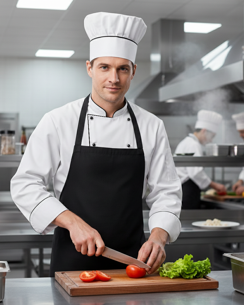 Klasyczna czapka kucharska z zaprasowanymi fałdami wykonana z tkaniny. Może posiadać dekoracyjną wypustkę w kontrastowym kolorze. Regulowana za pomocą rzepu z tyłu.