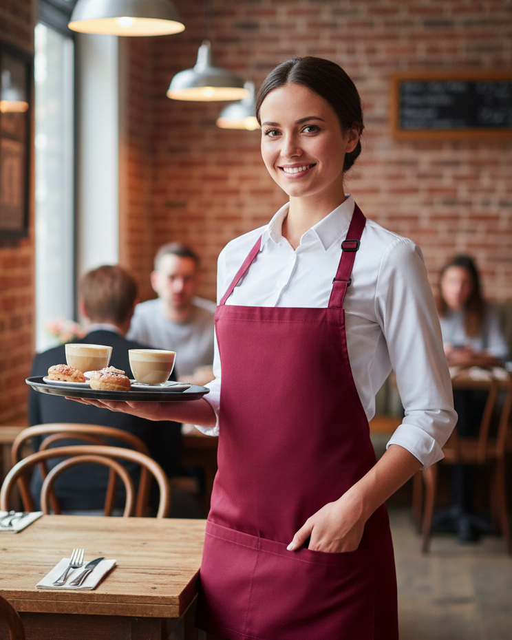 Praktyczny fartuszek o skróconym kroju, wykonany z łatwej w pielęgnacji tkaniny. Dostępny w wielu atrakcyjnych kolorach, posiada troki w pasie, klamerkę do regulacji przy pasku na szyję oraz kieszeń dzieloną na wysokości bioder.
