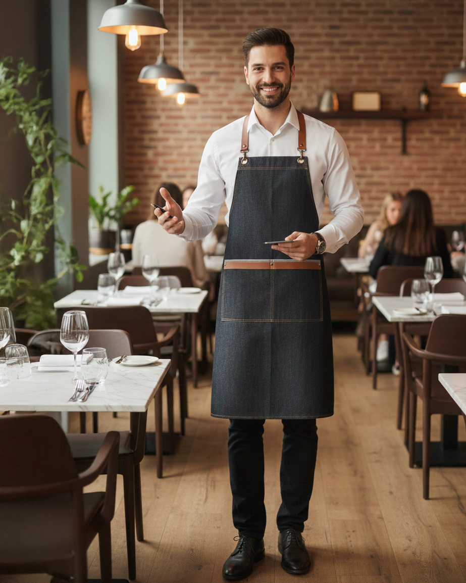 Ekskluzywny fartuszek z denimu z odpinanymi szelkami z naturalnej skóry. Na przodzie kontrastowe przeszycia oraz praktyczna kieszeń podzielona na dwie części, w której zmieszczą się notatnik, telefon, a także długopisy. Kieszeń wzmocniona jest metalowymi nitami oraz paskiem ze skóry na górze. Rozmiar oraz szerokość fartucha regulowane są za pomocą szelek, które występują w dwóch wersjach mniejszej (damskiej) oraz większej (męskiej). Odpinane szelki dają możliwość łatwiej wymiany fartucha na inny. Dodatkowe fartuchy (mogą być również w innym kolorze) są dostępne na zamówienie.