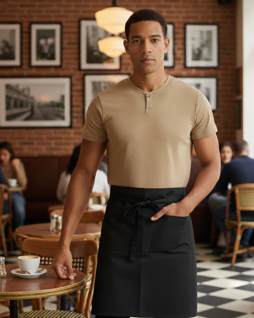 Koszulka męska z krótkim rękawem popularna wśród pracowników obsługi, wykonana z połączenia poliestru pochodzącego z recyklingu i bawełny pochodzącej ze zrównoważonych źródeł. Model zaprojektowany z jednym guzikiem na listwie. Miękki w dotyku.
