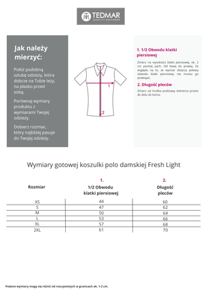 Ta koszulka to przykład nowoczesnego i stylowego elementu uniformu, która posiada cechy odzieży funkcjonalnej, a jednocześnie sprawia, że pracownicy wyglądają elegancko i profesjonalnie. Koszulka posiada właściwości odprowadzające wilgoć, które zapewniają wysoki komfort w gorących warunkach. Przemyślana konstrukcja z bocznymi panelami podkreśla kobiecą sylwetkę. Zapięcie na trzy guziki w kolorze dzianiny.